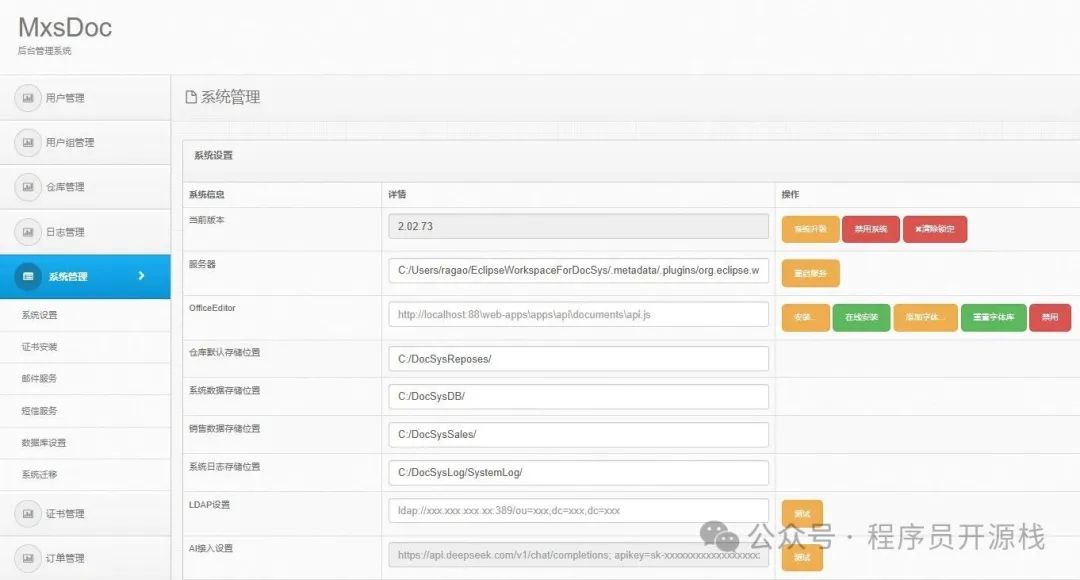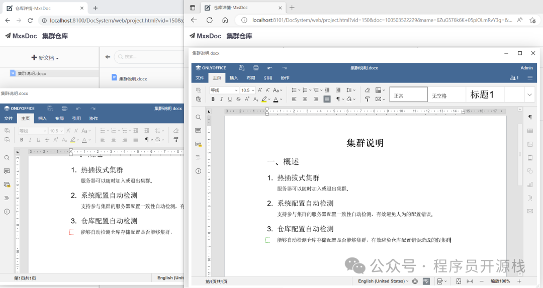 整个系统模块化设计清晰,便于功能扩展和维护。 项目体验 项目效果部署完成后,用户可以通过浏览器访问 MxsDoc 的 Web 管理界面,进行文件上传、下载、编辑、分享、搜索等操作。 系统界面简洁直观,操作逻辑清晰,即便是初次使用的用户也能快速上手。文件管理功能完善,支持多仓库管理,每个仓库可独立配置权限、加密策略、备份规则等。 在协同办公方面,Office/WPS 文件的在线预览和编辑功能非常实用,无需依赖本地软件即可实现多人协作。AI 功能的接入也使得知识库内容的搜索与处理更加智能化。 集群部署的支持,使得系统在企业级应用中也具备良好的扩展性和稳定性。 多仓库支持支持定义各自的文件存储、版本管理、权限管理、全文搜索和文件加密规则 存储更安全本地化文件存储方案,避免系统意外损坏对仓库文件造成影响