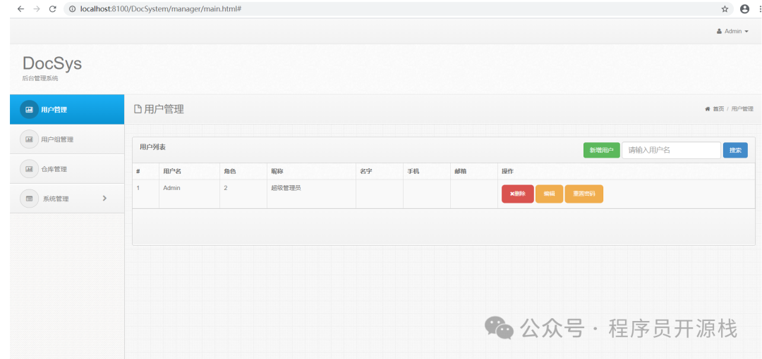 后台管理支持用户管理、用户组管理、仓库管理、系统管理