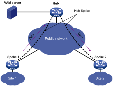 • Full-Mesh(全互联)网络:Spoke之间可以建立隧道直接通信;Hub主要作为路由信息交换的中心。如图 1所示,作为Spoke的Client节点在向VAM Server注册后获得该VPN域中Hub的信息,并与Hub建立永久的隧道连接;任意的两个Spoke之间也可以直接建立隧道,但该隧道是动态的,当在一段规定时间(Spoke-Spoke隧道空闲超时时间)内没有数据报文交互时,则删除该隧道。