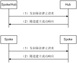 当Spoke注册成功后,要和Hub建立永久隧道,一个Spoke最多和两个Hub建立永久隧道。如果在一个VPN域中有两个Hub,则Hub之间需要建立永久隧道。具体隧道建立流程如图 5所示: