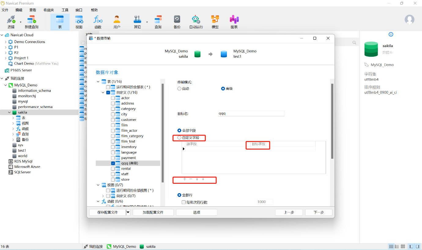 6、点击到勾选的表,右侧会显示两种传输模式:自动和高级。选择自动,Navicat 将使用默认设置进行传输。