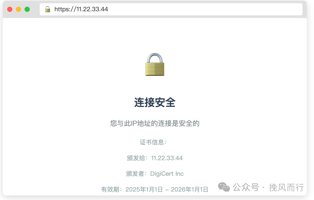 这样一来,你访问 https://<公网IP> 时,浏览器就能通过验证,直接显示小锁标志🔒。