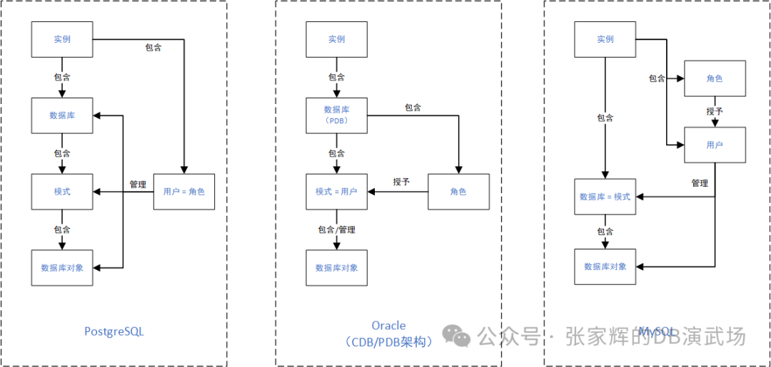 在Oracle和MySQL中,逻辑结构与PG有一些差异。例如在Oracle中用户与模式严格绑定,淡化了模式的概念;在MySQL中采用了扁平化的层级设计,数据库即是命名空间(模式)。