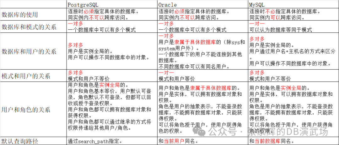 关于PostgreSQL、Oracle和MySQL三种数据库中逻辑架构,可以用下图概括: