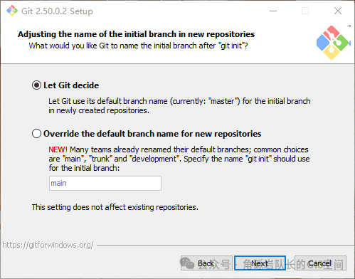 默认选项中的Let Git decide设置初始分支为master,如需选择修改,可选择下方Override the default branch name for new repositories,选择完毕,点击【NEXT】进入下一步;