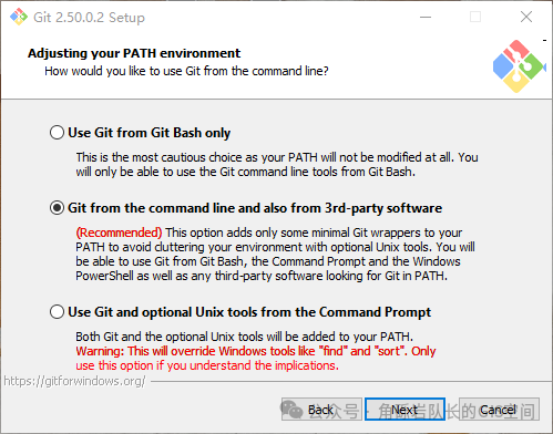 默认为【Git from the command line and also form 3rd-party software】,即通过命令行及第三方工具使用Git,选择完毕,点击【NEXT】进入下一步;