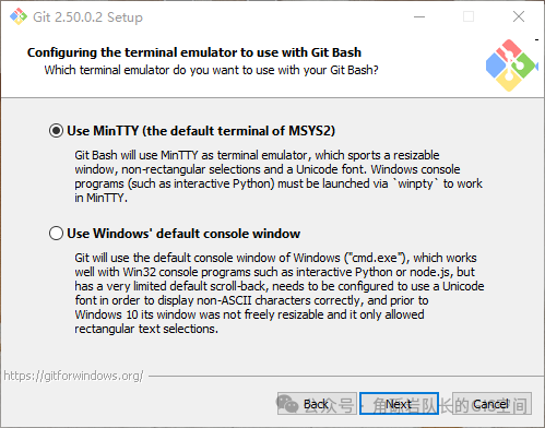 通常使用默认的Use MinTTY方式,选择完毕,点击【NEXT】进入下一步;