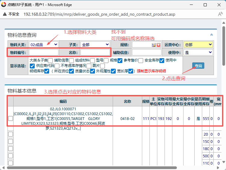 弹出界面之后,先选择物料大类,然后点击查询(找不到可用编码或名称筛选),再点击选择对应的物料信息