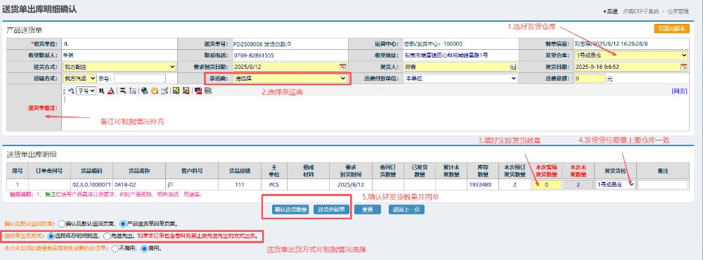 进入发货界面,按图操作:选好发货仓库以及承运商备注根据情况补充。然后填好实际发货数量发货货位要跟上面仓库一致,最后确认发货并回单