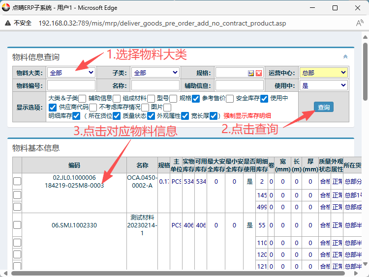 在弹出的物料信息窗口内,选择物料大类,点击查询。然后点击对应物料信息