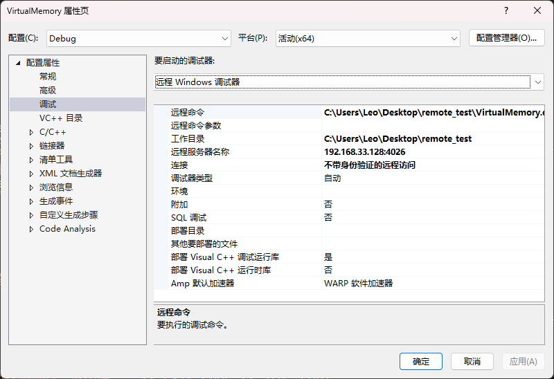 • 远程命令:填入测试机(或虚拟机)可执行文件路径。如 C:\Users\Leo\Desktop\remote_test\VirtualMemory.exe