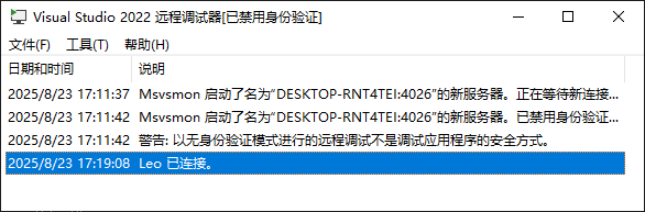• 远程服务器名称:目标机器名称。msvsmon.exe 日志显示的名称,如 DESKTOP-RNT4TEI;这里也可以 IP+端口形式连接