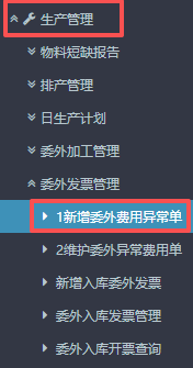 1. 进入ERP系统之后,在左侧的功能菜单里找到“生产管理”,点开“委外发票管理”,点击“新增委外费用异常单”。