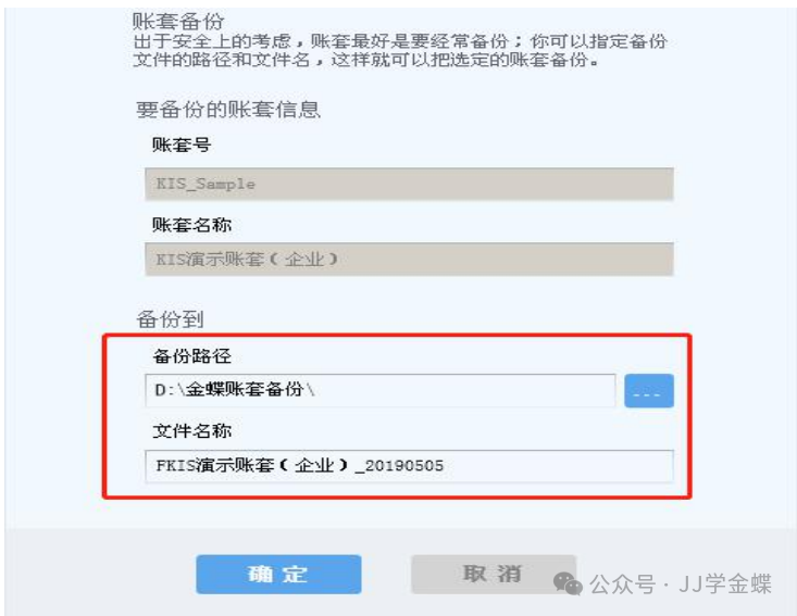 选择备份账套保存位置,建议勾上【备份到企业云盘】,点击【备份】按钮,这样在本地路径和金蝶企业云盘中同时进行备份。