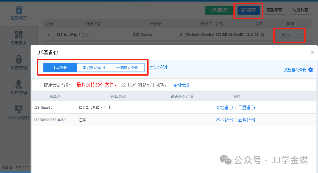 服务器电脑右下角任务栏双击打开【金蝶KIS专业版系统管理】-账套后面-更多-手动备份,如下图所示: