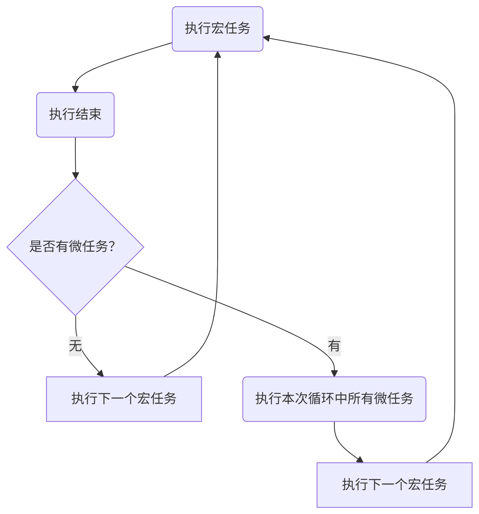 宏任务表示执行时间较长的任务,在每次时间循环时只会执行一个宏任务,执行完毕后处理微任务队列,所有微任务都执行完毕后进入下一个宏任务。