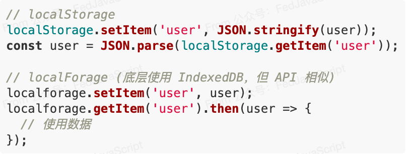 3. localForage:使用类似 localStorage 的简单 API,但底层利用 IndexedDB