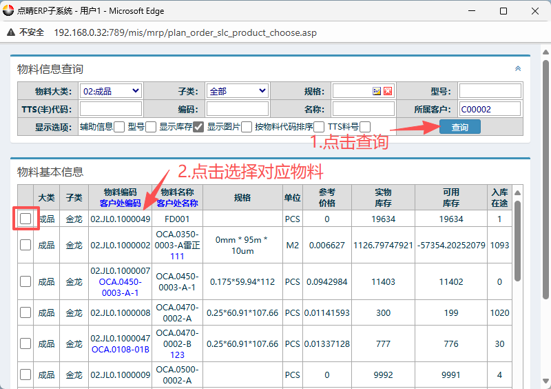 选好客户后,在下方点击“物料编码”,弹出对应窗口。