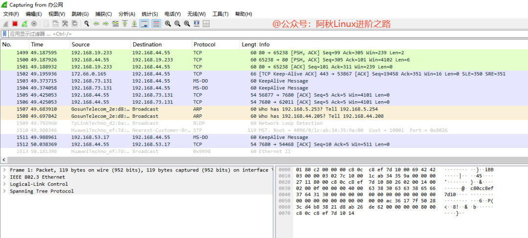 在 Wireshark 的显示过滤器栏中,输入ftp-data 并回车。会看到一系列数据包,协议显示为 FTP-DATA。这些包里面就承载着实际的文件内容。