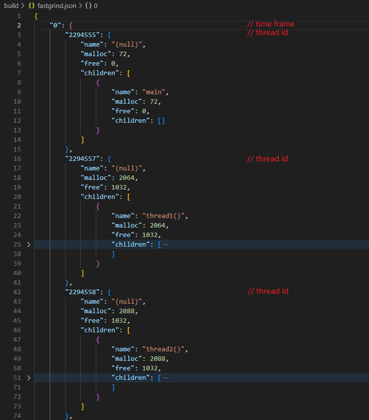 fastgrind.text 是类似于 Linux 下 perf report 格式的输出。有函数级别的调用栈内存申请/释放统计,在vscode等editor下可以进行子调用栈折叠。