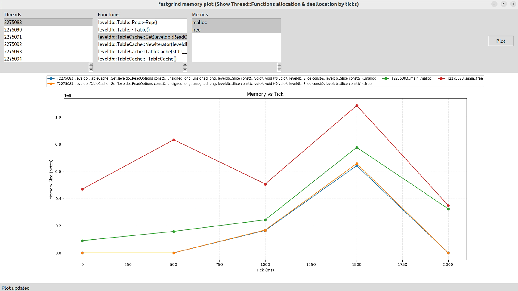 以第三方开源库 leveldb 为例,监控其内存分配:
